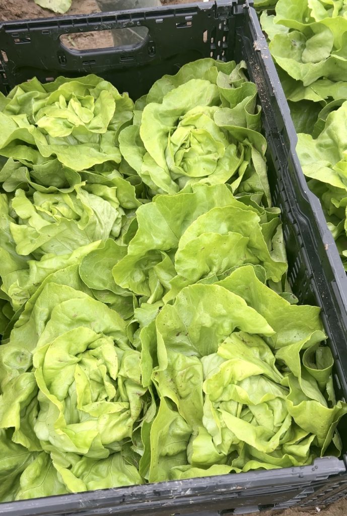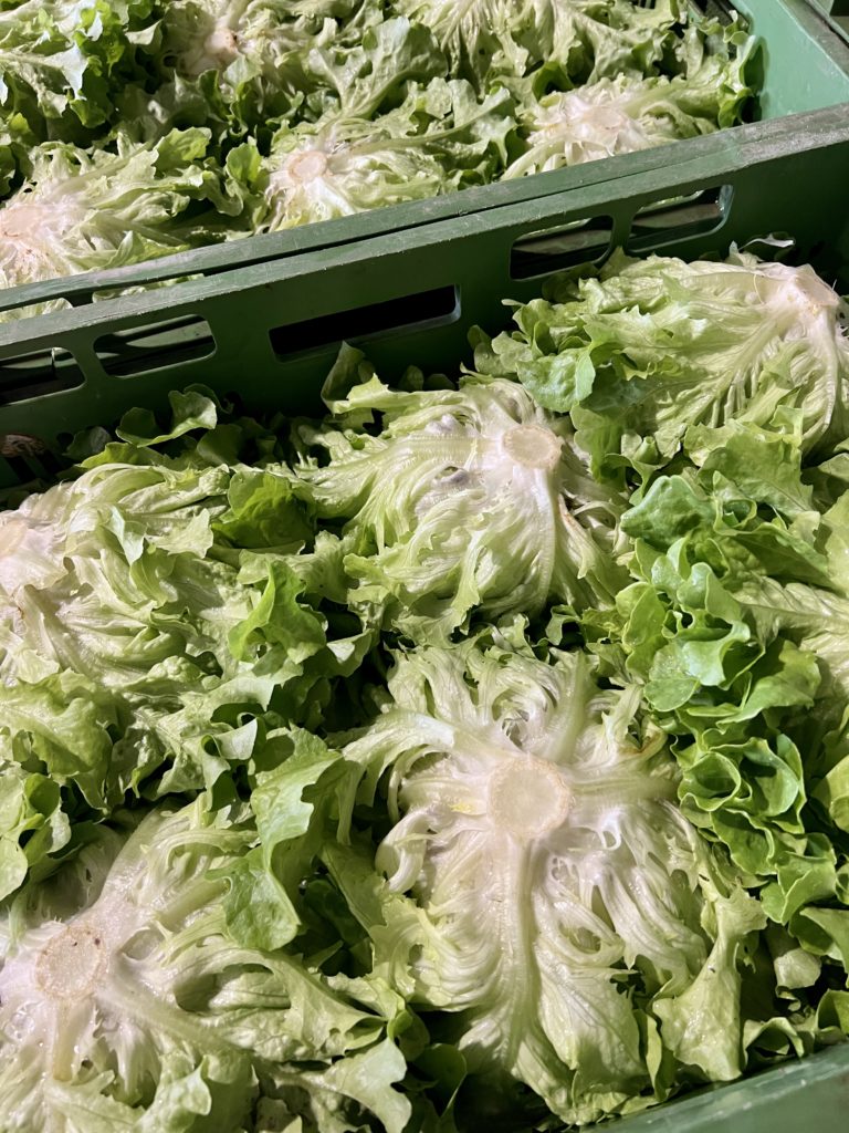 Les salades coupées à la base, manuellement, sont nettoyées des feuilles abîmées et mises en caisse à l’envers (ou à l’endroit en fonction des clients) pour être transportées ensuite au hangar où elles seront lavées.