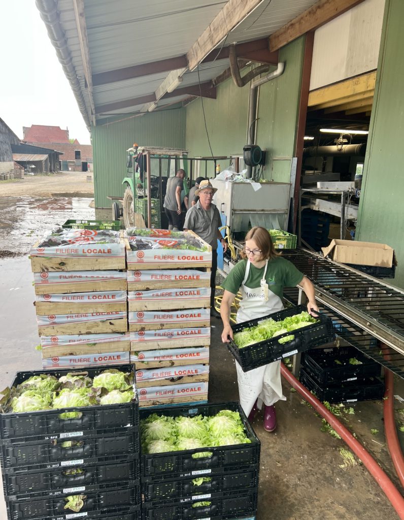 « On coupe au champ en fonction des demandes. Les légumes sont amenés et lavés dans l’entrepôt, emballés, étiquetés et mis en frigo ou sur palettes avant de partir dans nos deux camions de livraison.”