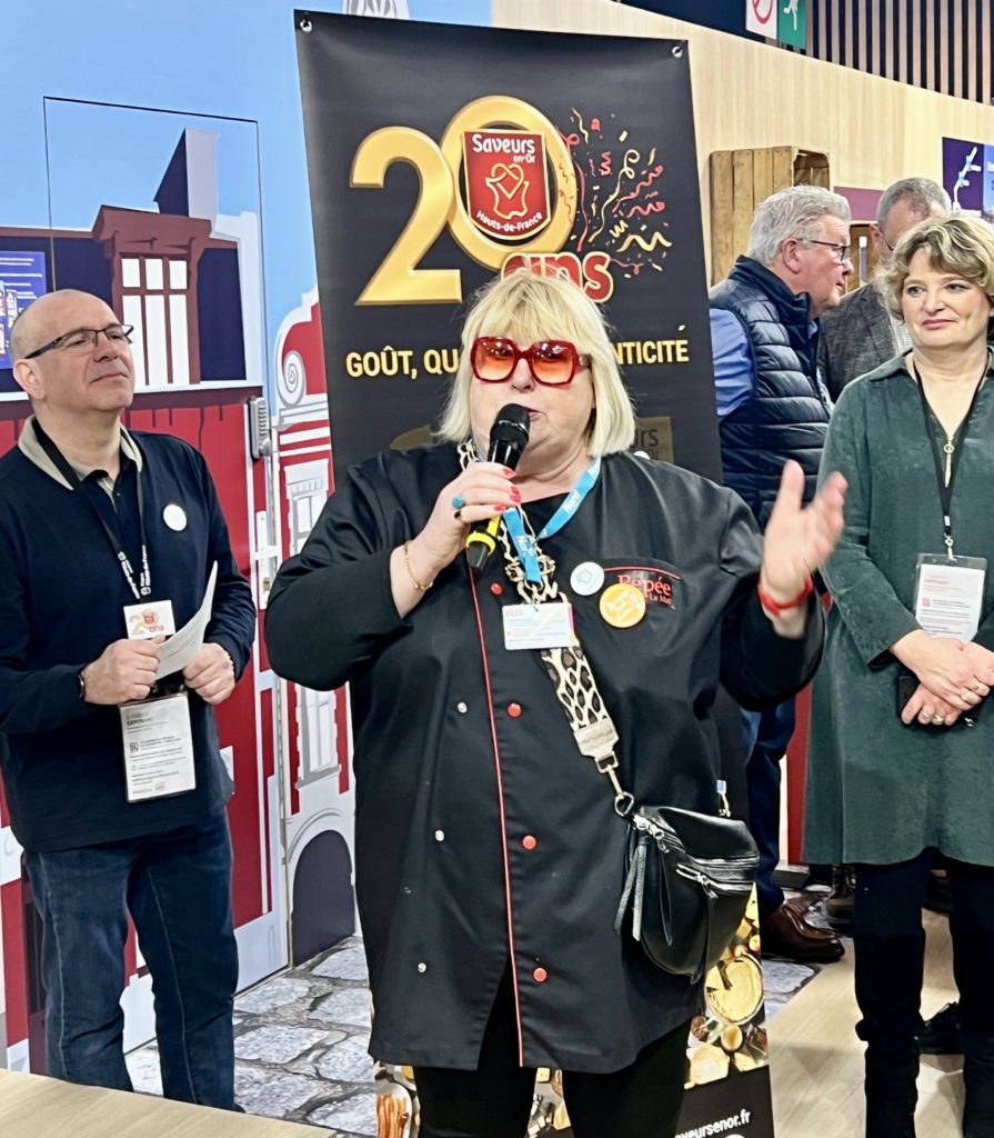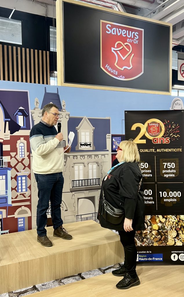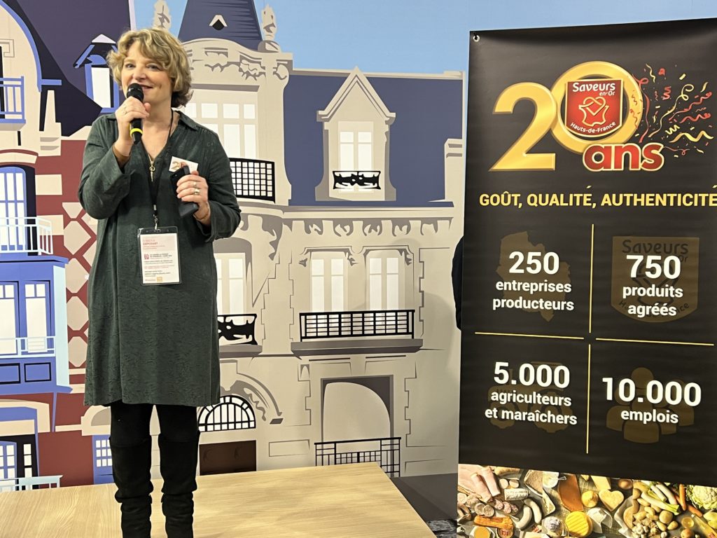 Pépée Le Mat, chroniqueuse culinaire a été chaleureusement remerciée pour son engagement pour la marque. Une ambassadrice de la première heure ! « Saveurs en’Or est une marque incontournable que tout le monde connaît dans les Hauts-de-France. Qui n’a jamais vu le logo rouge et or dans les boutiques et les magasins ? On ne peut pas y échapper ! C’est une fierté d’être ambassadrice de cette marque et de la Région depuis toujours, avec toutes les femmes et les hommes qui font les bons produits des Hauts-de-France. »