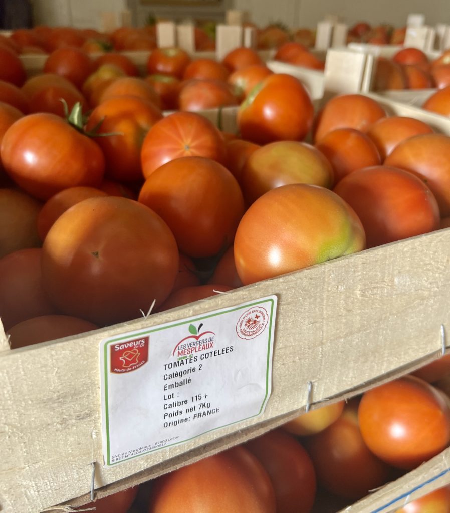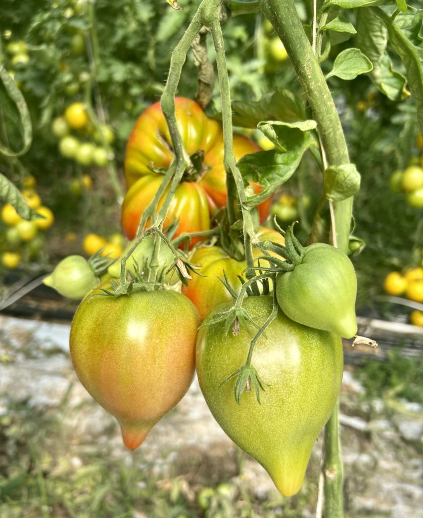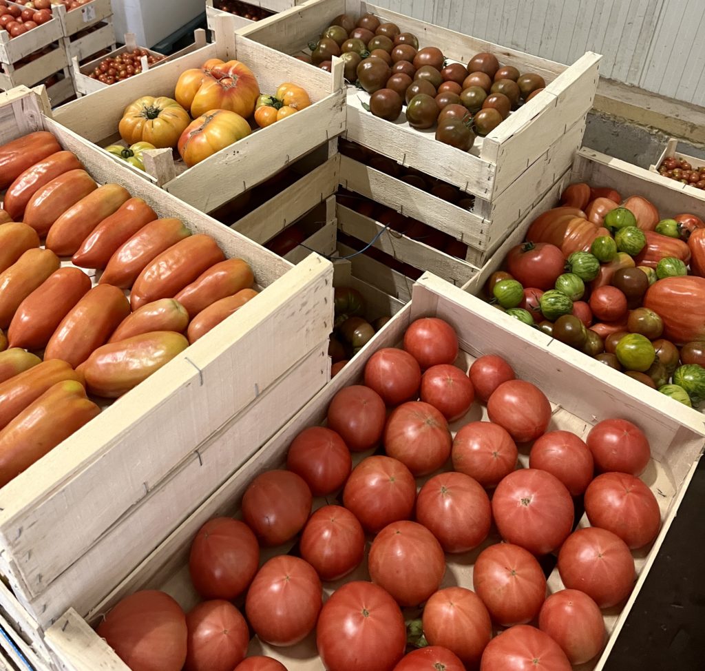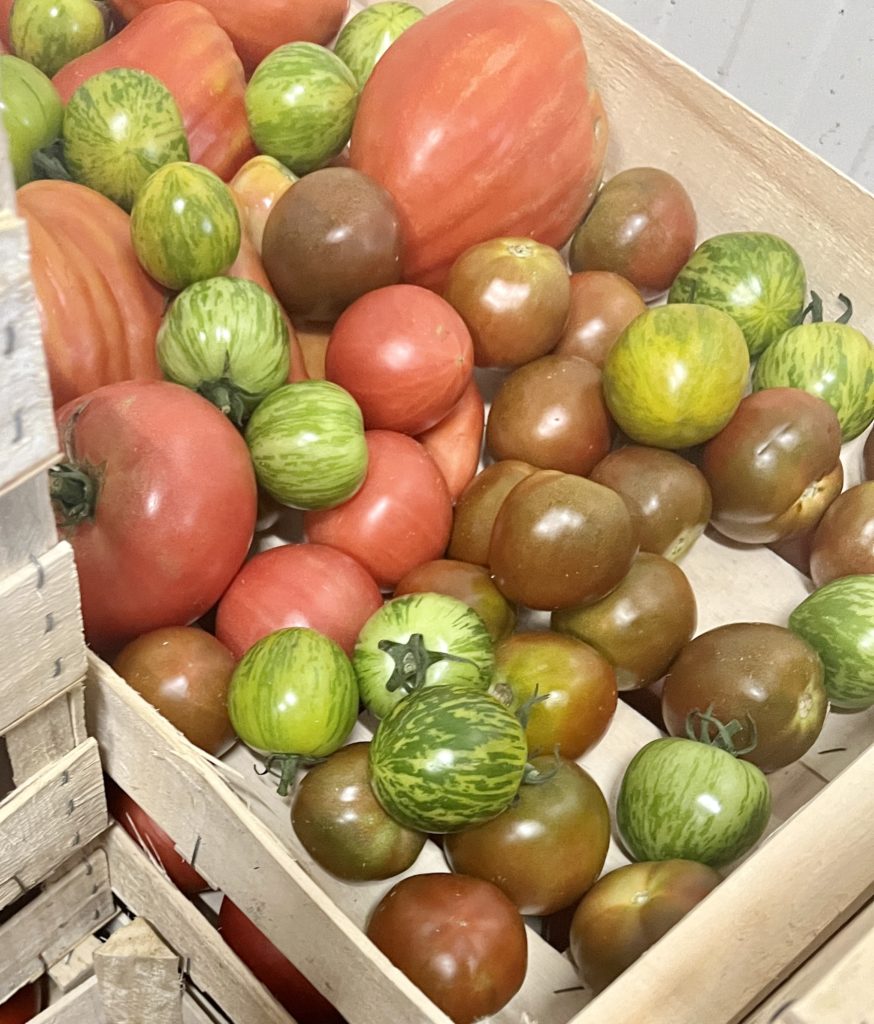 “Nous cultivons des tomates Ananas, Cœur de bœuf, Green Zebra, Andine Cornue, Noire de Crimée et des tomates rondes et côtelées”, égrène Maxime Monvoisin. En ce moment, elles sont cueillies tous les jours, avec délicatesse par les salariés qui passent entre les rangs pour repérer les plus mûres.