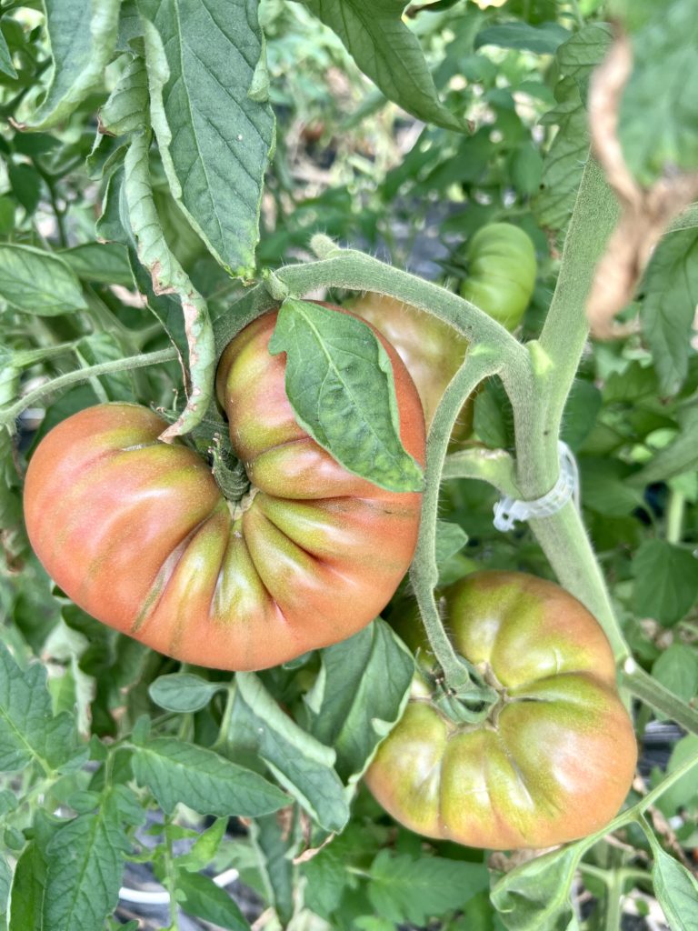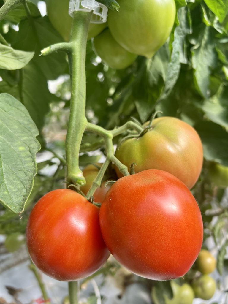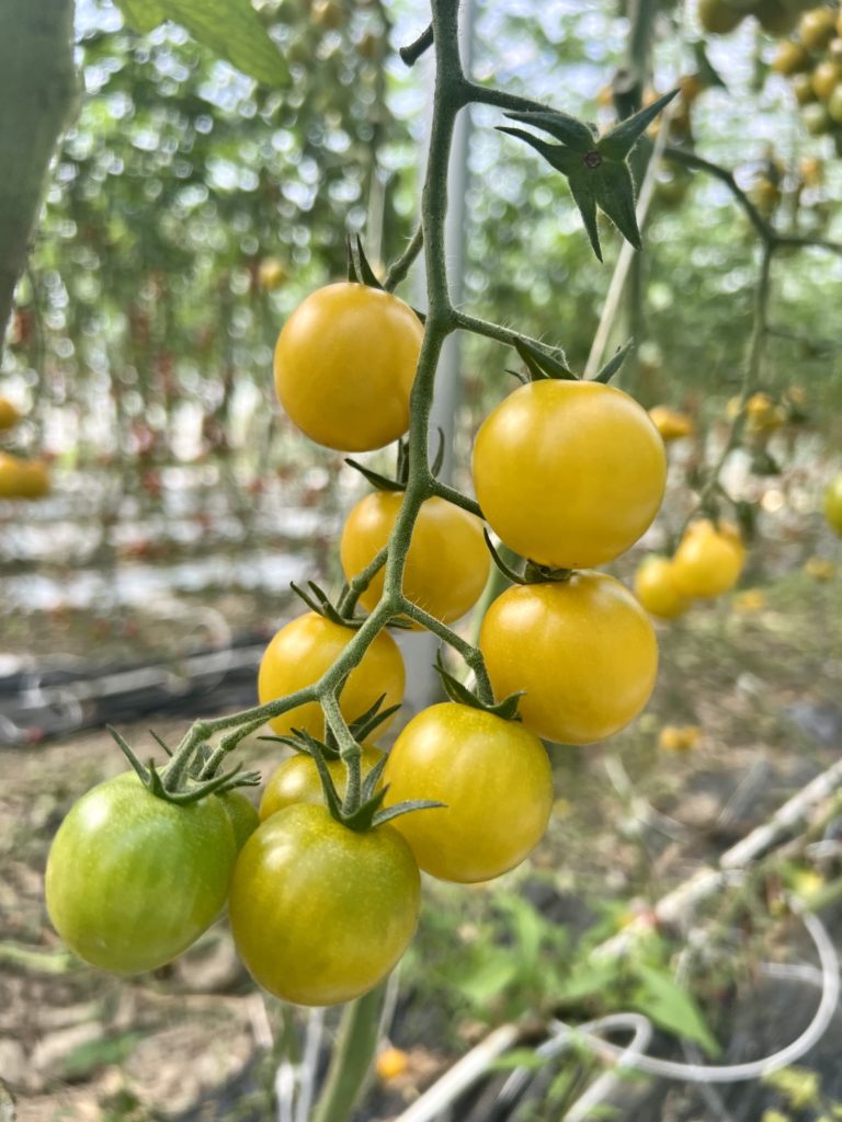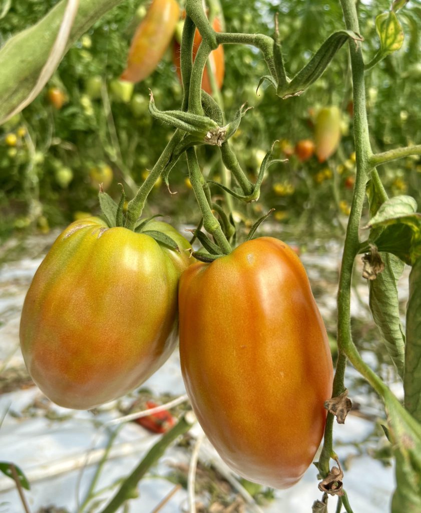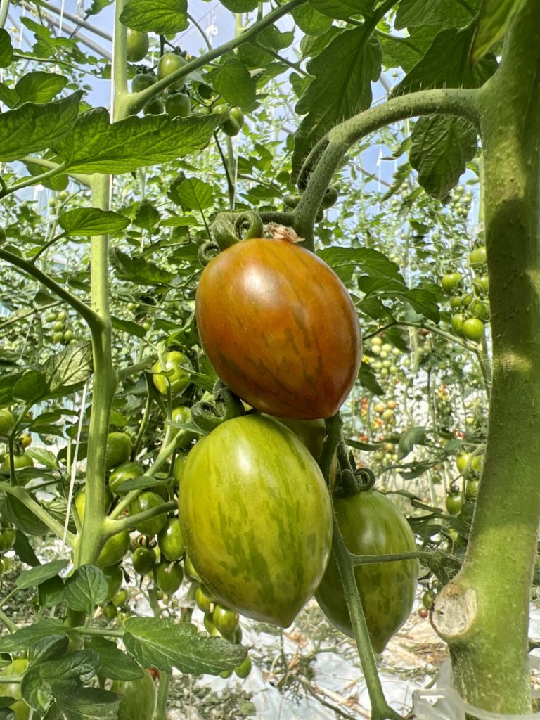 “Nous cultivons des tomates Ananas, Cœur de bœuf, Green Zebra, Andine Cornue, Noire de Crimée et des tomates rondes et côtelées”, égrène Maxime Monvoisin. En ce moment, elles sont cueillies tous les jours, avec délicatesse par les salariés qui passent entre les rangs pour repérer les plus mûres.
