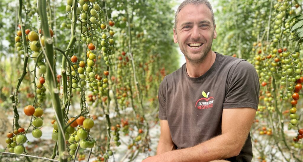 Il fait chaud dans la serre, les 30°C sont largement dépassés : une température idéale pour faire pousser la quinzaine de variétés de tomates cultivées par le GAEC de Mespleaux, composé des deux frères Maxime et Samuel Monvoisin. “La saison des fraises est presque finie, nous avons lancé la récolte des tomates il y a 3 semaines, avec une petite semaine de retard en raison d’un printemps frais”, explique Maxime Monvoisin.