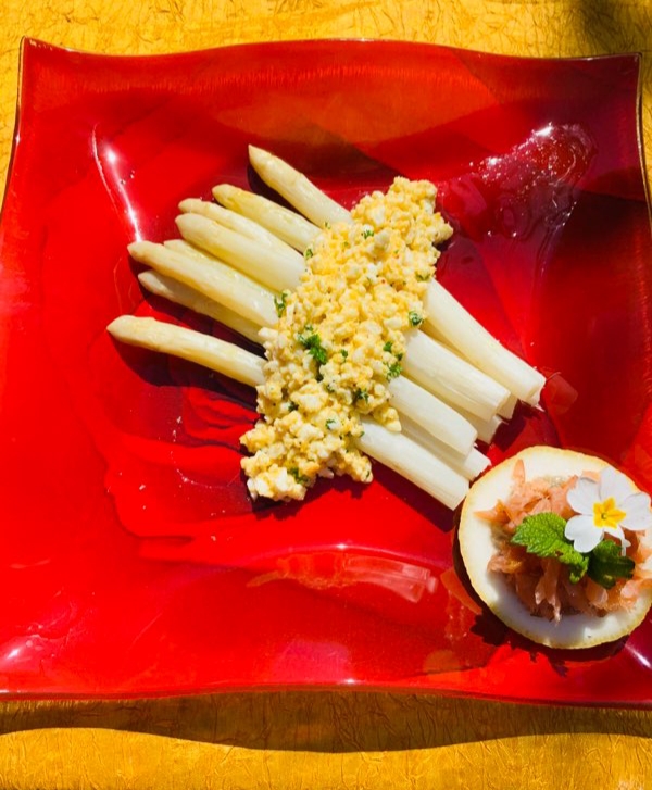 – Dresser dans l’assiette chaude vos asperges tièdes, coulez votre sauce et parsemez généreusement de persil.