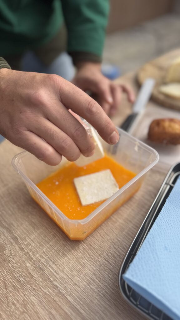 Passez les morceaux dans la farine, puis dans le jaune d’œuf battu.