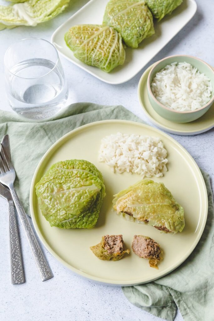 Nettoyer le chou et enlever soigneusement les feuilles. Faire bouillir de l’eau salée dans une grande marmite, puis plonger les feuilles de chou à l’intérieur, pendant 2-3 minutes. Les sortir et les plonger dans de l’eau glacée pour stopper la cuisson (pour les blanchir). Egoutter les feuilles.
