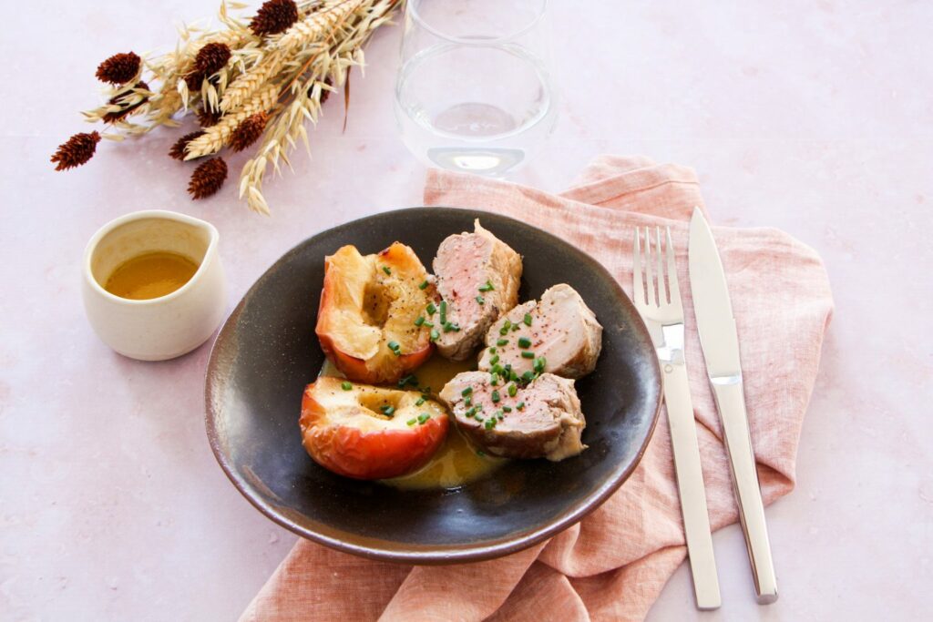Filet mignon de porc, pommes rôties et sauce crémeuse à la pomme