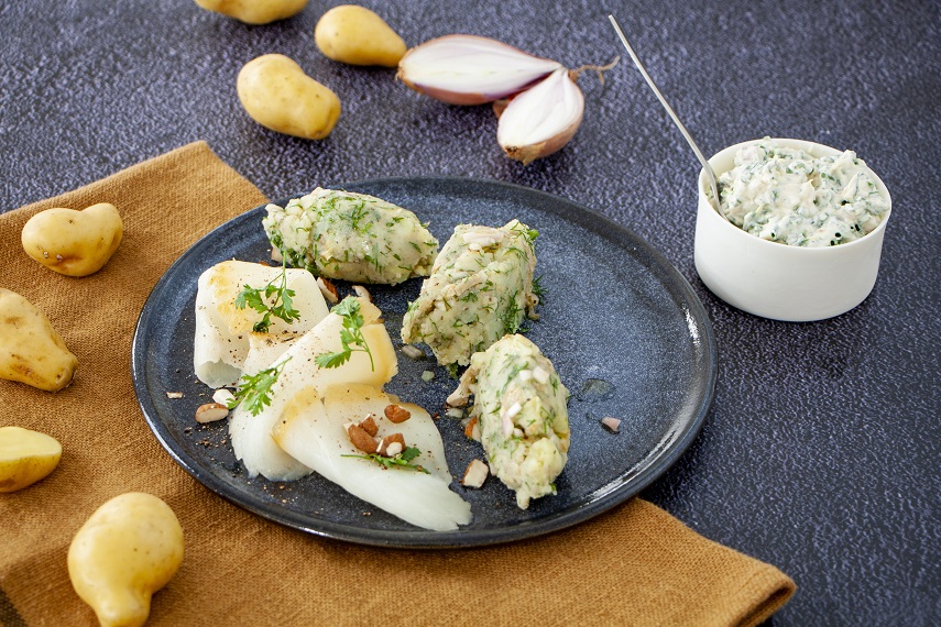 Dressez les tranches de flétan fumé dans une assiette de service. Parsemez quelques amandes concassées sur le poisson et un zeste de citron. Ajoutez 3 quenelles d’écrasée de pommes de terre, terminez par une cuillère de yaourt aux fines herbes et servez le reste à part.
