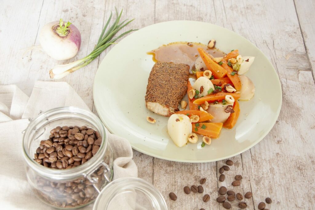 Pavé de veau, viennoise au café et jus corsé, carottes nouvelles glacées