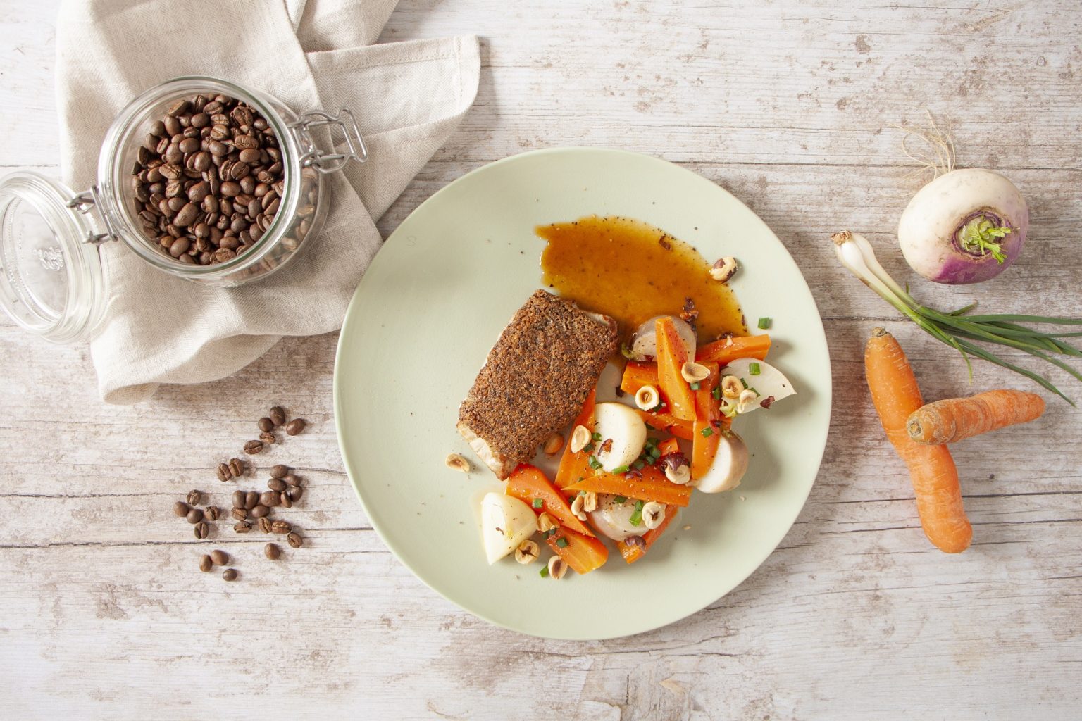 Pavé de veau, viennoise au café et jus corsé, carottes nouvelles glacées