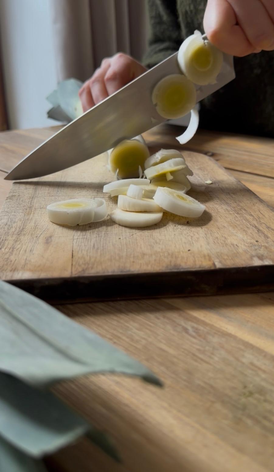 Mélanger cette préparation avec les poireaux, l’oignon et le jambon