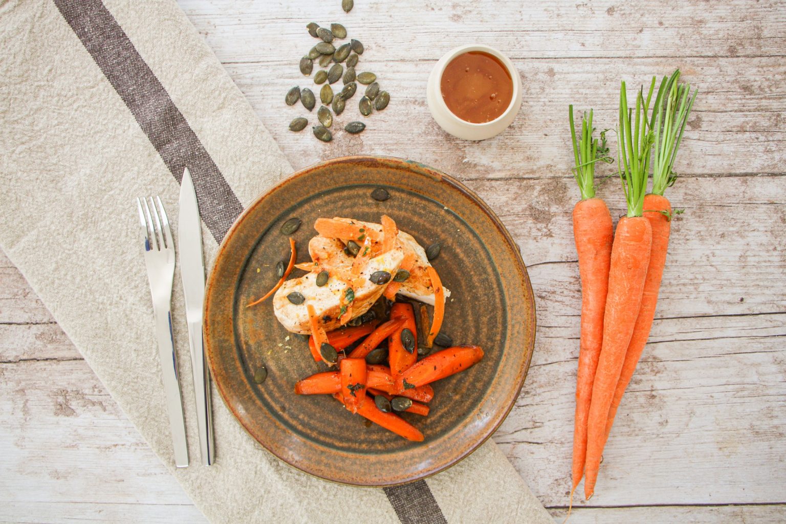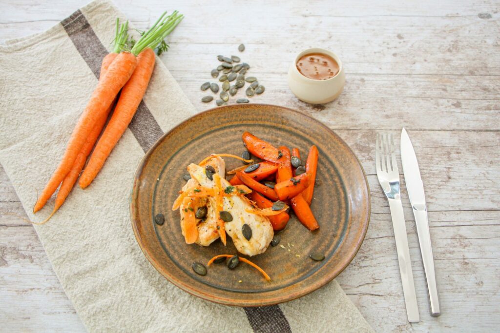 Suprême de volaille, carottes rôtie au miel, graines de courge